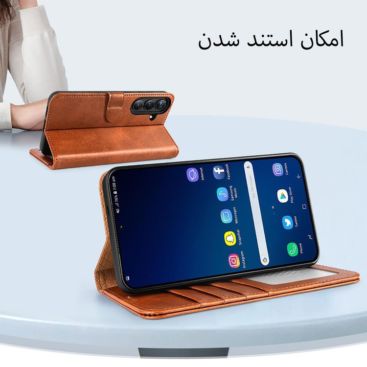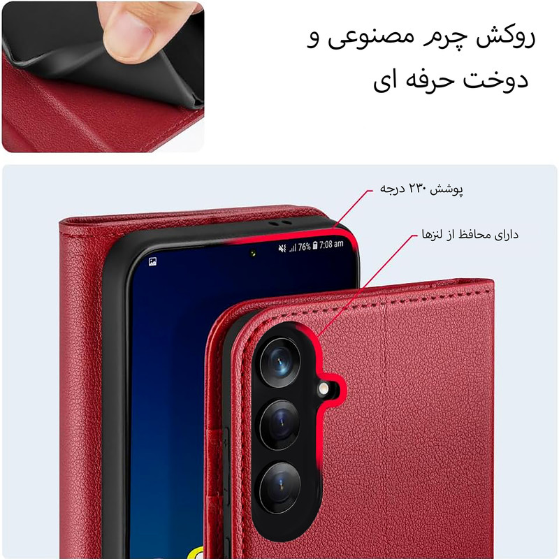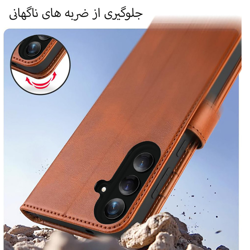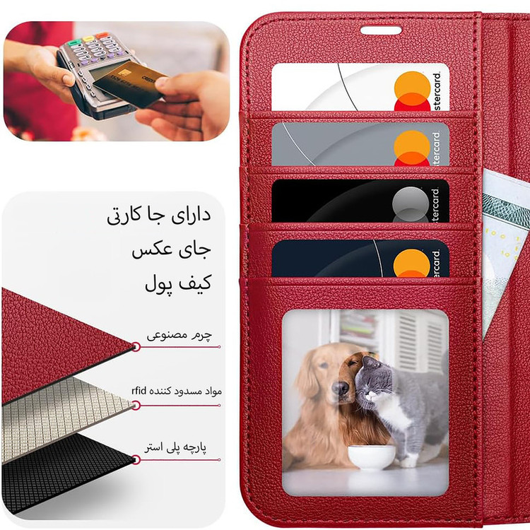 قابلیت استفاده به صورت استند دارای جای کارت و وجه نقد چرم مصنوعی با کیفیت کاربردی و مقاوم کیفیت دوخت بالا دارای قفل آهنربایی رنگ بندی متنوع برش دقیق درگاه ها پوشش کامل درگاه ها دارای محافظ لنز