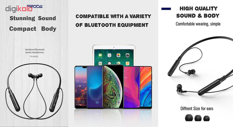 هدفون بیسیم PD-BN200 از کمپانی پرودا یک هدفون گردنی با کیفیت ساخت بالا است و بدنه آن ضد تعریق است. این هدفون دارای شفافیت صدا بالا و بیس قوی است که با دارا بودن سه نوع سرگوش سیلیکونی ضد تعریق است که باعث میشود با تمام فرم گوشها حداکثر سازگاری را داشته باشد . این هدفون دارای قفل آهنربایی قوی است که در زمانی که هدفون روی گردن شماست آن را قفل کنید. دامنه فرکانس این هندزفری 20Hz-20kHz بوده و همین امر باعث شده تا تمامی صداهای زیر و بم را دریافت کرده تا سبک های موسیقی را با جزئیات کامل به گوش شنونده برساند. از آنجایی که این هدفون با یکبار شارژ کامل بین 12 تا 15 ساعت قابلیت گوش دادن به موسیقی را دارد پس ارگونومی و وزن هدفون بسیار مهم بوده تا گردن در این مدت دچار خستگی نشود و این موضوع نیز از دید کمپانی پرودا پنهان نمانده و با وجود باتری 200 میلیآمپری وزن این محصول تنها 40 گرم است که در حالت عادی متوجه وزن این محصول نمیشوید. از نکات قابل اشاره به این هدفون که کیفیت عمومی پخش صدا و حداکثر فاصله تا گوشی را بالا برده استفاده از جدیدترین چیپ بلوتوث در هدفون یعنی ورژن 5.0 است که باعث میشود حتی با فاصله 10 متر از گوشی نیز بدون قطعی به موسیقی گوش کنید. این هدفون با داشتن شیار MicroSD نیز از مموری کارت تا سقف 32 گیگابایت پشتیبانی میکند و میتوانید بدون بلوتوث آهنگهای مورد علاقه خود را گوش دهید.