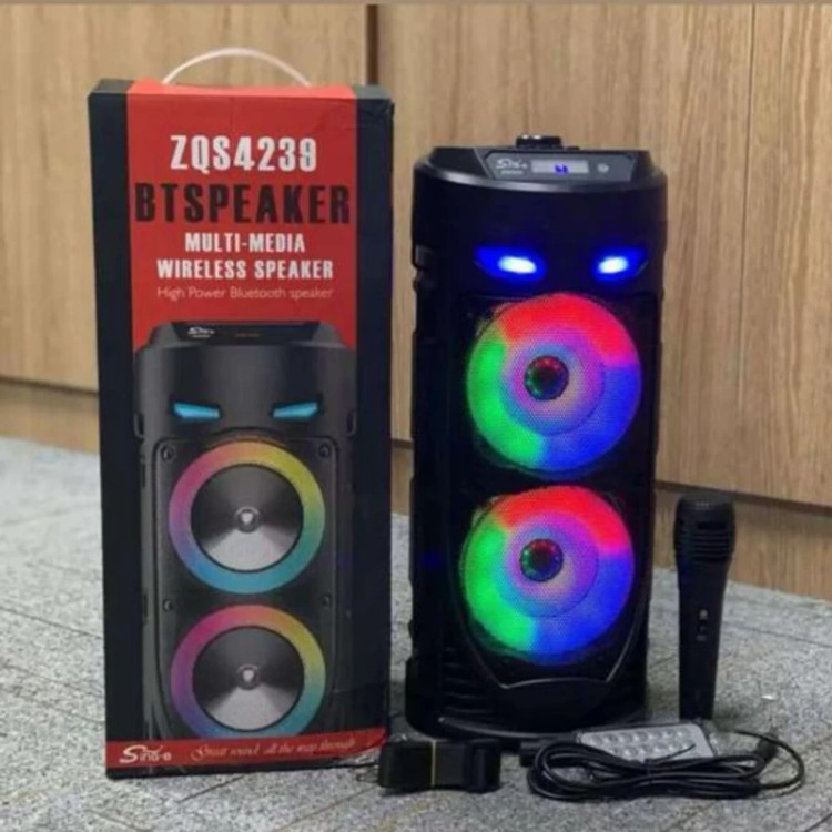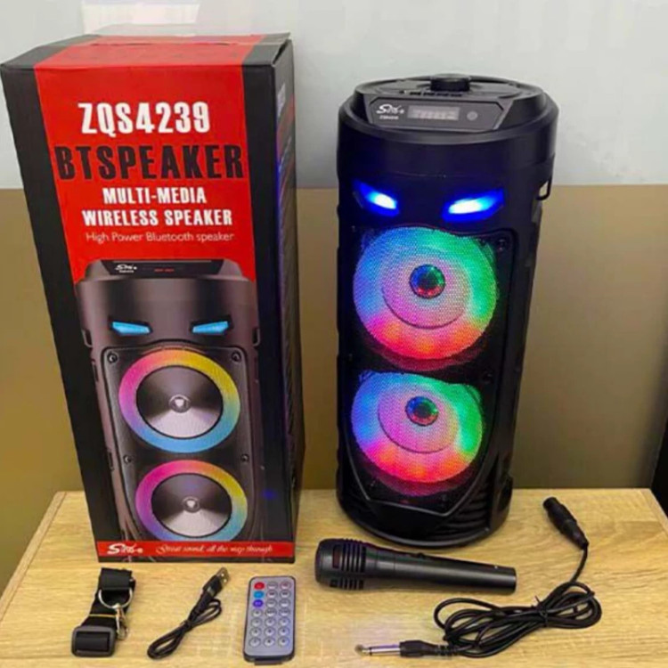 ✅اسپیکر ZQS ✅مدل 4239 ✅مدل 2×6.5" اینچ ✅قابلیت بلوتوث+فلش+رم خور ✅دارای ولوم کم و زیاد کردن صدا ✅میکروفون دار ✅ میزان شارژردهی 6ساعت ✅قدرت هرساب 10وات ✅باتری 3500 میلی آمپر ✅میزان شارژر شدن 3ساعت ✅بیس دار ✅ دارای رقص نور